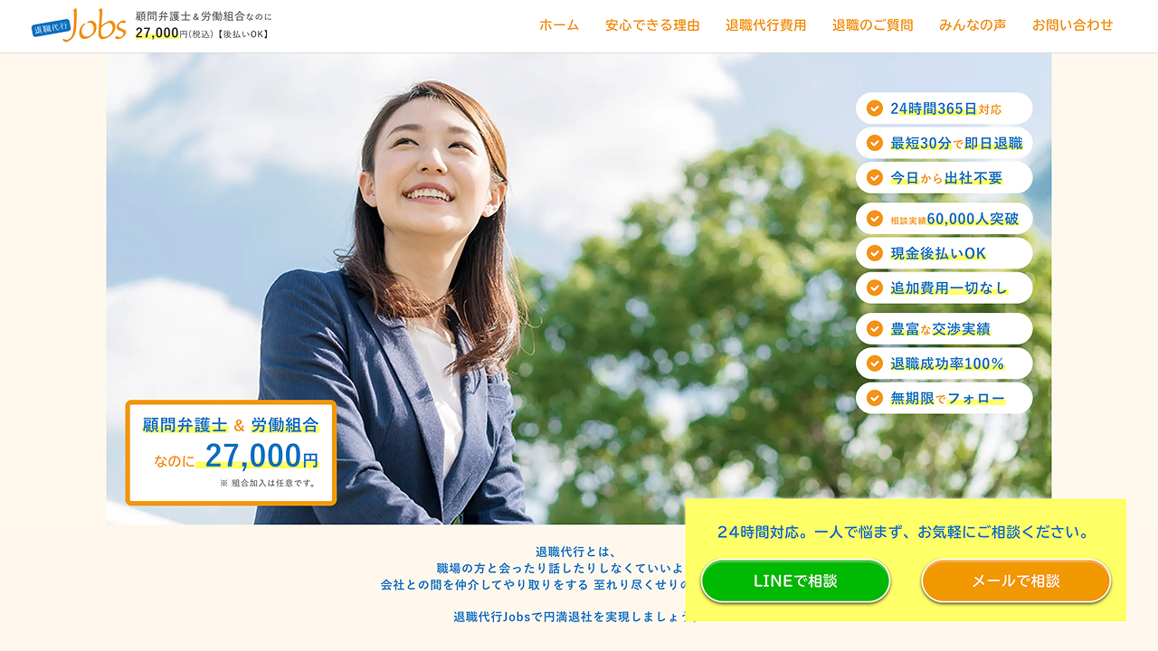 ![]() 退職代行Jobs | 親身なLINE対応 メンタルケア特典 詳細を見る | 民間 (労組提携) | 安心プラン 29,000円*1 シンプルプラン 27,000円*2 | 伝達 交渉 | ◯ | ◯ | ◯ | ◯ | クレジットカード/コンビニ決済/PayPay/現金翌月払い/銀行振込 | LINE メール 電話 | 24H | 全国 | ◯ | ◯ |