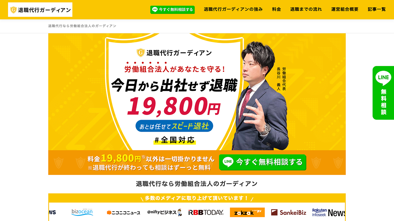 退職代行 ガーディアン | 19,800円 詳細を見る | 東京都労働委員会に認証された「本物」の合同労働組合が直接運営。代理店を挟まないため交渉力が段違いで、会社側も無視できません。過去失敗ゼロの鉄板サービスです。 |