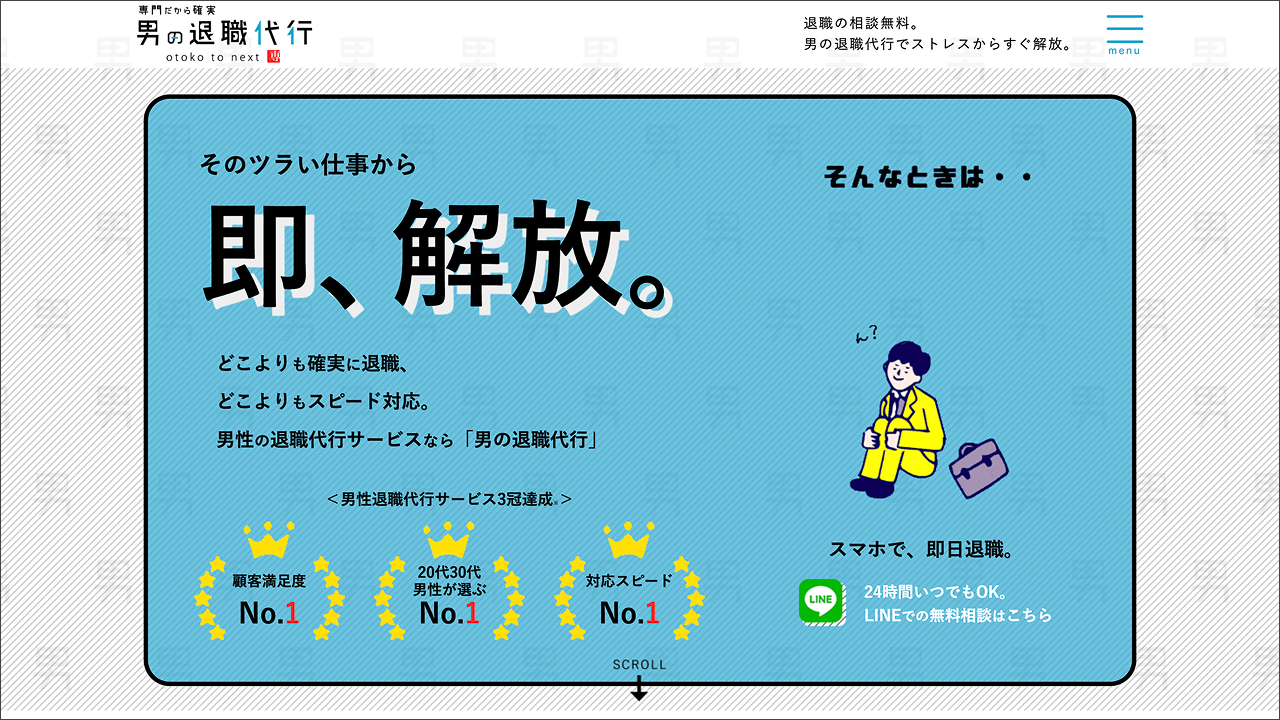 男の退職代行 | 18,800〜21,800円 詳細を見る | 「男のくせに」「責任感がない」といった、男性特有の精神論で引き止めを行う体育会系の職場に特化。JRAA特級認定の交渉力で、強引な上司も黙らせて退職を確定させます。 |