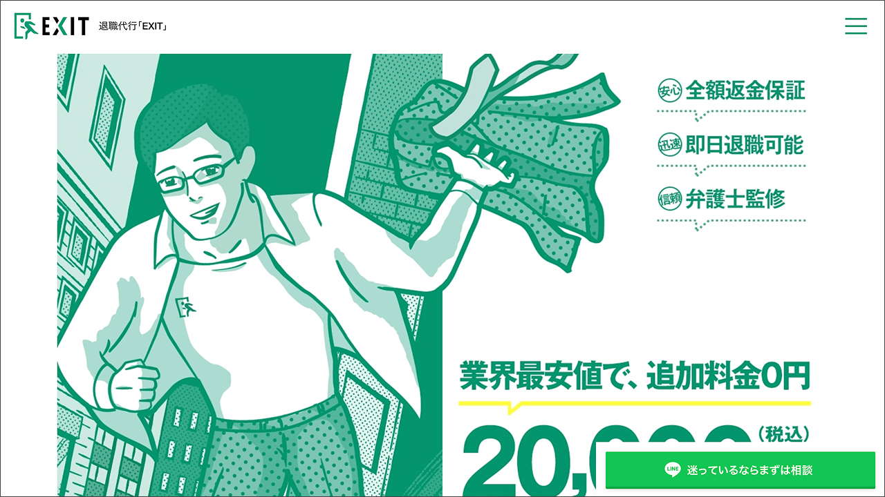 退職代行EXIT | 20,000円 詳細を見る | 毎年1万件以上をさばく業界のパイオニアで、余計なオプションを削ぎ落としたシンプルさとスピード感が売りです。 |