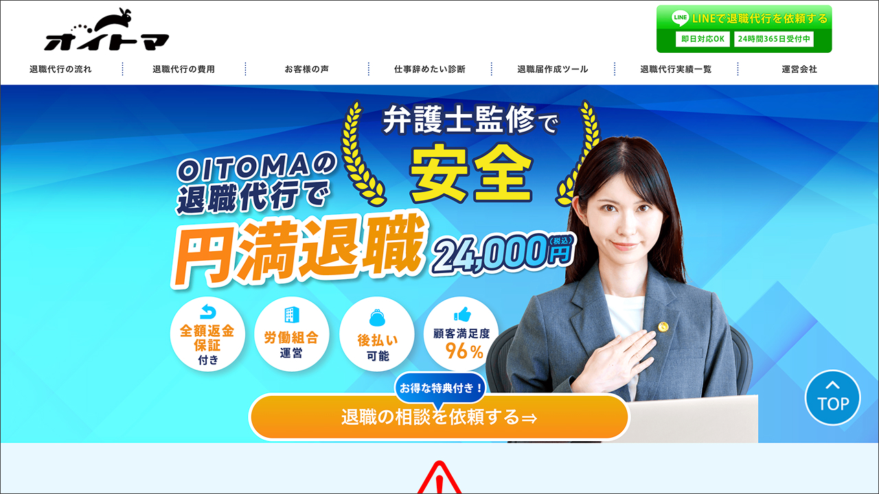 退職代行OITOMA | 24,000円 詳細を見る | 労働組合運営の安心感に加え、万が一退職できなかった場合の全額返金保証もあり、経済的リスクを抑えて依頼できます。 |