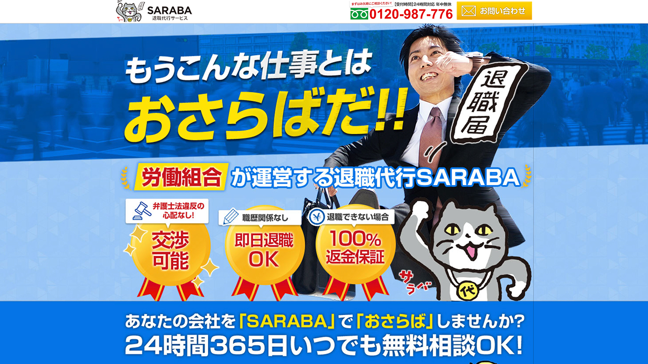 退職代行SARABA | 24,000円 詳細を見る | 「とくダネ!」などメディア掲載多数の老舗。24時間365日、深夜でも即レス対応してくれるスピード感が命。「明日絶対に行きたくない」という緊急事態に頼りになります。 |