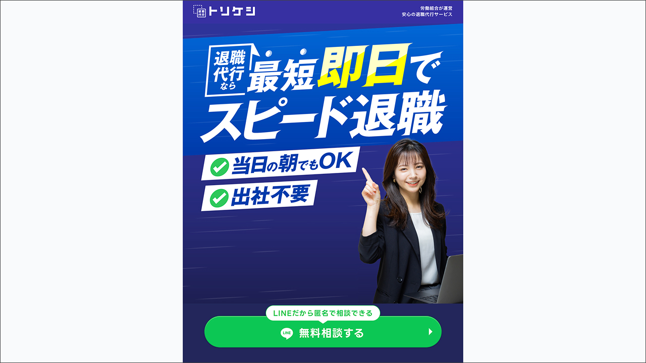退職代行トリケシ | 24,000円 詳細を見る | 難しい書類作成や電話ヒアリングは一切なく、LINEのトーク画面だけで全ての手続きを完結させることができます。 |