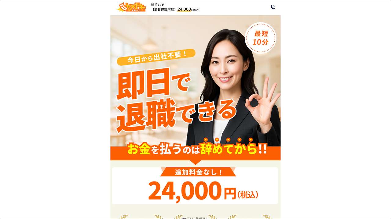 退職代行ヤメドキ | 24,000円 詳細を見る | 完全成果報酬型を採用しており、万が一退職できなければ支払いは発生しません。 お金を払ったのに失敗したら…というリスクを物理的にゼロにできる、慎重派向けのシステムです。 |